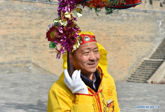 Hao Laixi's son Hao Yongjun performs Ekou Naoge at a scenic spot in Daixian County, north China's Shanxi Province, Feb. 23, 2021. 73-year-old Hao is an inheritor of the national intangible cultural heritage Ekou Naoge performance, an art form integrating dancing, music, art with acrobatics. It is a local tradition to perform Ekou Naoge during the celebration of the Lantern Festival. This year, Hao decided to present an online performance for the festival at the suggestion of his son and grandson. (Xinhua/Chai Ting)