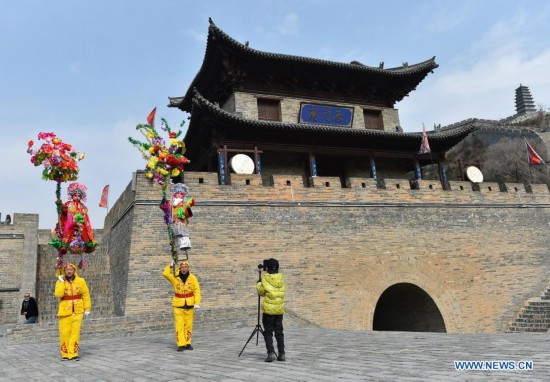 Hao Laixi and his son perform Ekou Naoge via live streaming at a scenic spot in Daixian County, north China's Shanxi Province, Feb. 23, 2021. 73-year-old Hao is an inheritor of the national intangible cultural heritage Ekou Naoge performance, an art form integrating dancing, music, art with acrobatics. It is a local tradition to perform Ekou Naoge during the celebration of the Lantern Festival. This year, Hao decided to present an online performance for the festival at the suggestion of his son and grandson. (Xinhua/Chai Ting)
