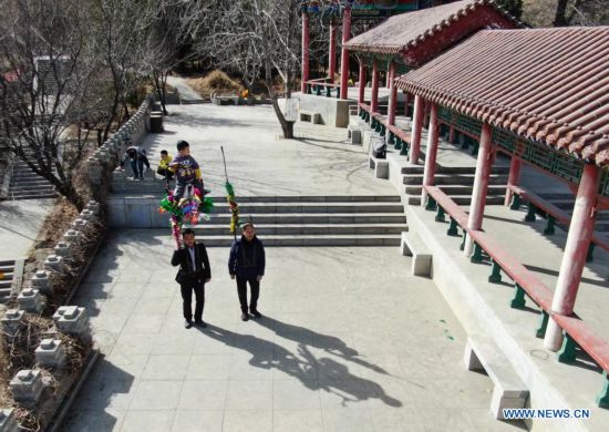 Hao Laixi (R) and his son practice performing Ekou Naoge at a park in Daixian County, north China's Shanxi Province, Feb. 22, 2021. 73-year-old Hao is an inheritor of the national intangible cultural heritage Ekou Naoge performance, an art form integrating dancing, music, art with acrobatics. It is a local tradition to perform Ekou Naoge during the celebration of the Lantern Festival. This year, Hao decided to present an online performance for the festival at the suggestion of his son and grandson. (Xinhua/Chai Ting)