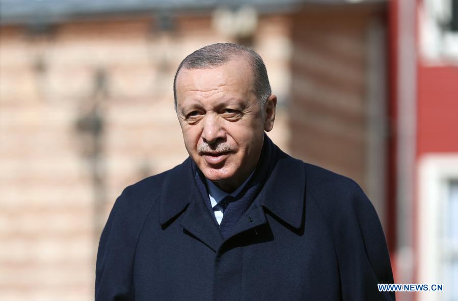 Turkish President Recep Tayyip Erdogan speaks after Friday prayers in Istanbul, Turkey, on Feb. 26, 2021. Erdogan described on Friday the attempted military takeover in Armenia as "unacceptable," noting that Turkey is against all types of coups. (Xinhua)