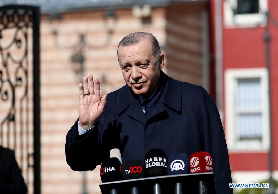 Turkish President Recep Tayyip Erdogan waves to reporters after Friday prayers in Istanbul, Turkey, on Feb. 26, 2021. Erdogan described on Friday the attempted military takeover in Armenia as "unacceptable," noting that Turkey is against all types of coups. (Xinhua)