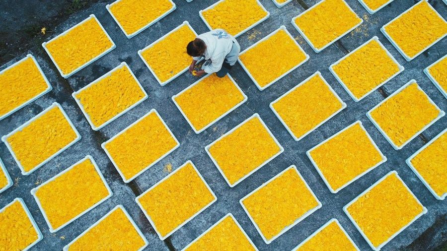 Aerial photo shows a villager drying chrysanthemum flowers in Jinxi Village of Xima Township, Longli County of southwest China's Guizhou Province, Oct. 27, 2020.(Xinhua/Yang Wenbin)