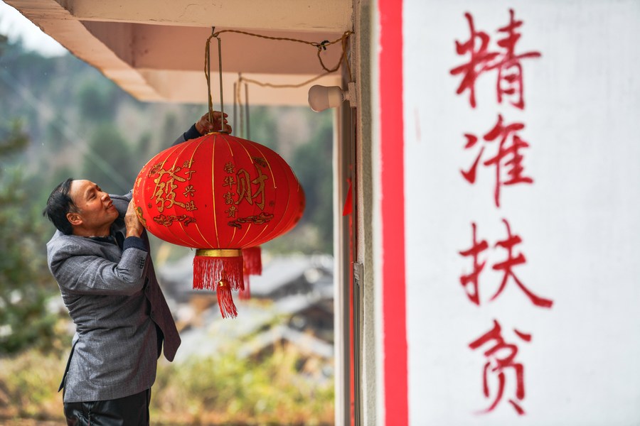 A villager who has shaken off poverty, arranges a red lantern in front of his new residence at Sangma Village, Yingshan Township in Dushan County of southwest China's Guizhou Province, Jan. 25, 2020. (Xinhua/Yang Wenbin)