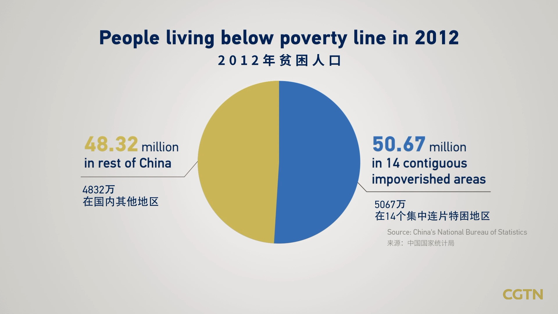 In 2012, there were more than 50 million people living below the national poverty line in these areas, accounting for over half of China's total impoverished rural population.