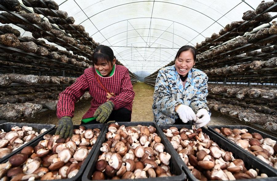 Villagers sort out just-harvested mushrooms at an edible fungus growing base at Minjiachang Village, Minxiao Township in Jiangkou County of southwest China's Guizhou Province, Jan. 3, 2019. (Xinhua/Yang Wenbin)