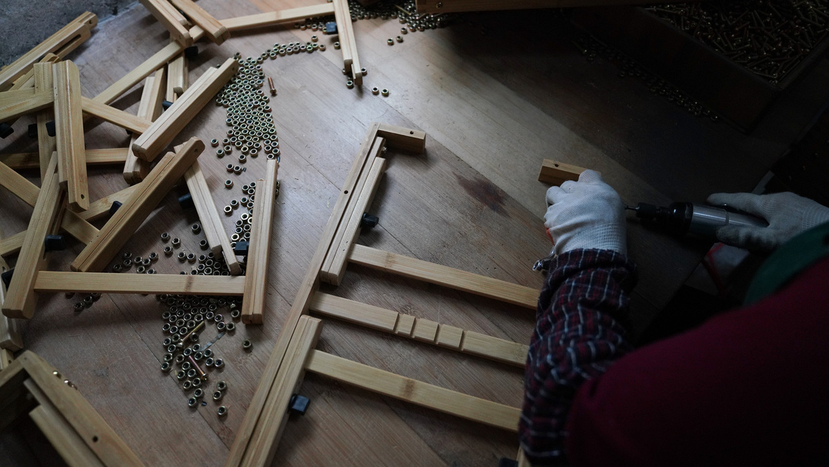 A staff member assembles bamboo-made tables and chairs. [Photo/Xinhua]