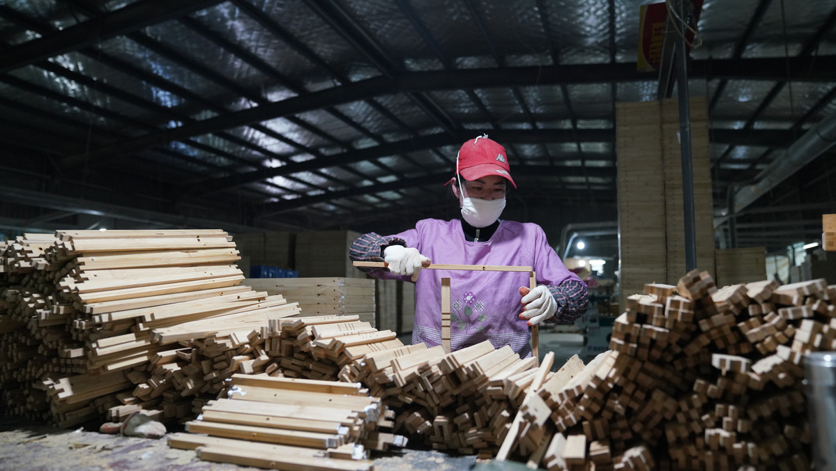 A staff member assembles bamboo-made tables and chairs. [Photo/Xinhua]
