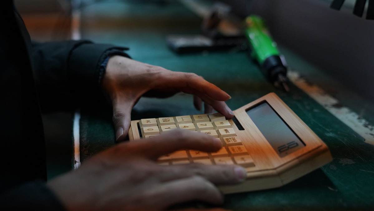 A staff member debugs a bamboo-made calculator in Tonggu county, Jiangxi province, on Feb 26. [Photo/Xinhua]