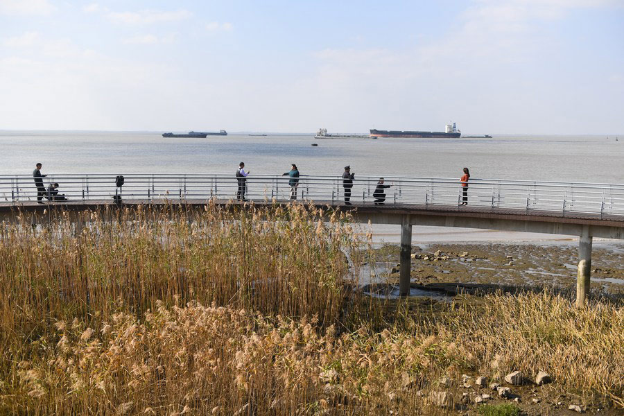 Tourists go sightseeing on a walkway by the shoreline of Yangtze River in Nantong City, east China's Jiangsu Province, Nov. 13, 2020. (Xinhua/Ji Chunpeng)