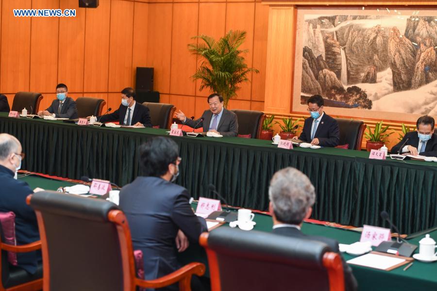 Xia Baolong, vice chairman of the National Committee of the Chinese People's Political Consultative Conference and head of the Hong Kong and Macao Affairs Office of the State Council, attends a symposium to solicit opinions from representatives from all walks of life in Hong Kong on improving the special administrative region's electoral system and upholding "patriots governing Hong Kong" in Shenzhen, south China's Guangdong Province, from Feb. 28 to March 1, 2021. (Xinhua/Mao Siqian)