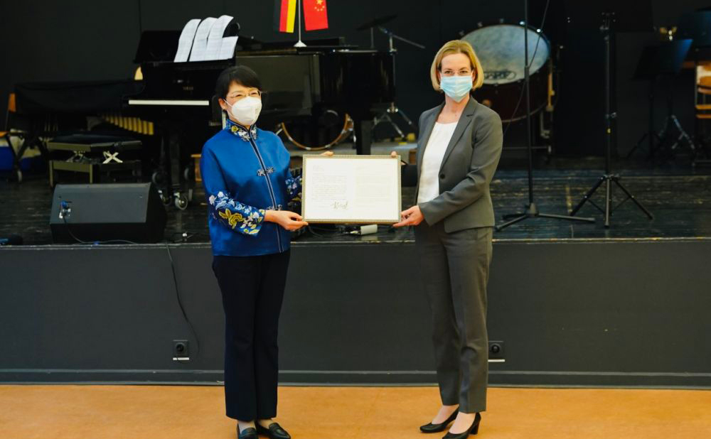 Guo Jinqiu, the wife of Chinese ambassador in Germany, handed over the letter to Germany's Burg Gymnasium high school from Peng Liyuan, wife of Chinese President Xi Jinping. Principal Simone Reuen and over 10 students and teachers from the school joined the ceremony last week.