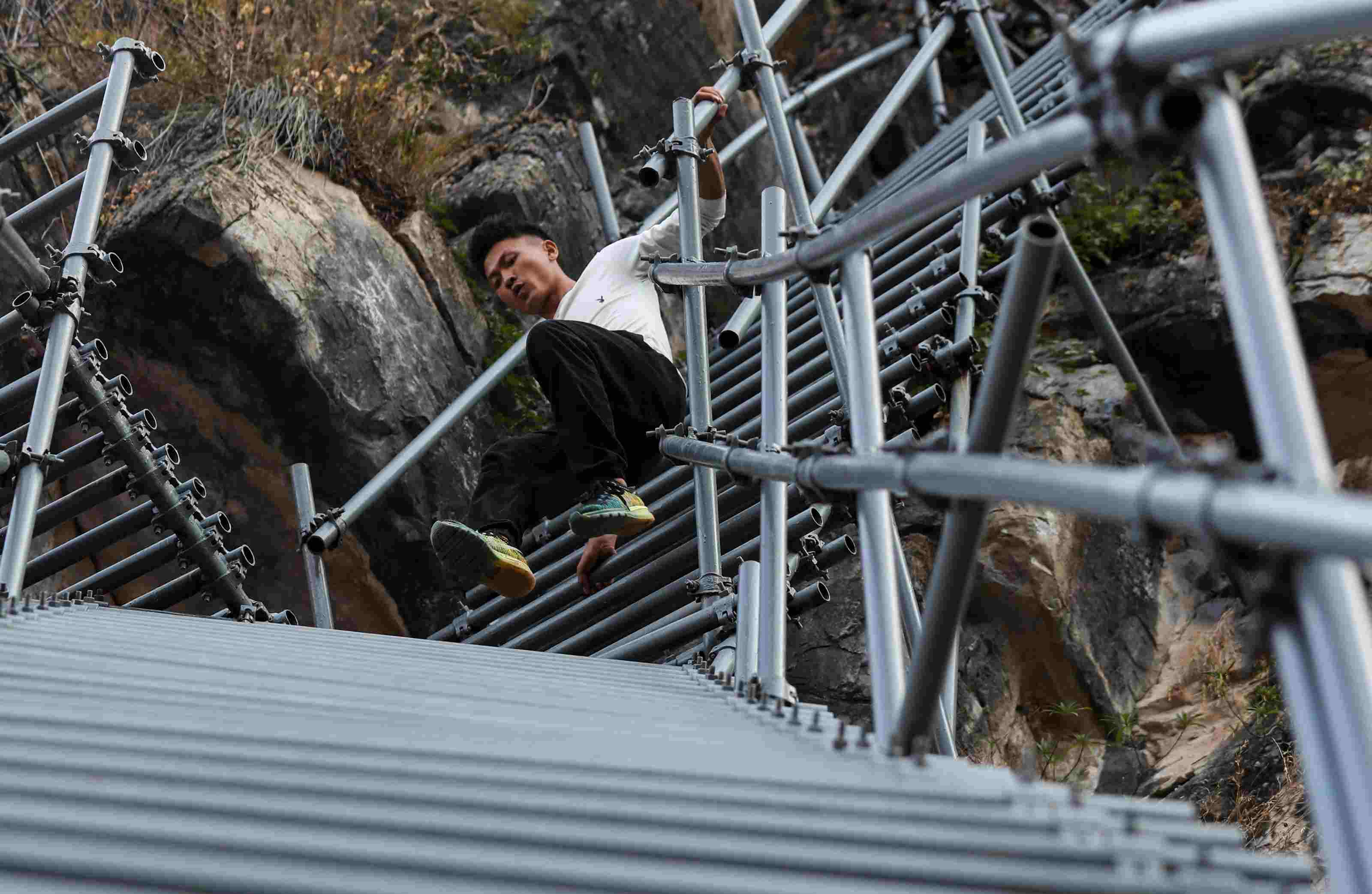 In August 2016, reconstruction work on the ladder kicked off as part of a poverty alleviation campaign. And eight months later, a firm, steel ladder with 2,556 steps took shape, built with some 6,000 steel pipes.
