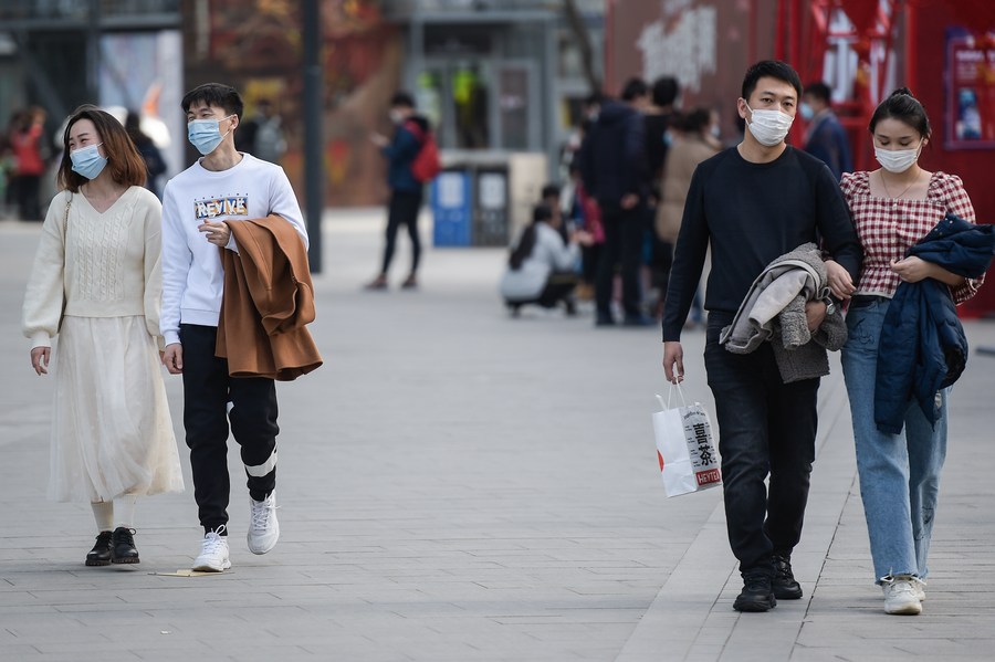 People walk at Han's Plaza in Daxing District in Beijing, capital of China, Feb. 21, 2021. (Xinhua/Peng Ziyang)