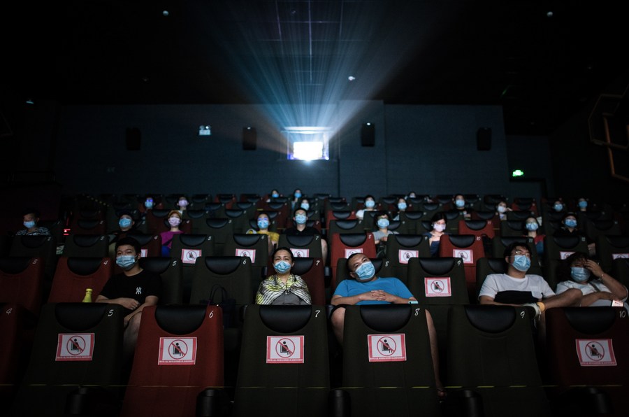 People watch a movie in a cinema in Wuhan, central China's Hubei Province, July 20, 2020. (Xinhua/Xiao Yijiu)