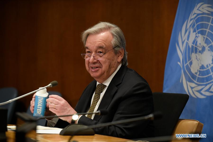UN Secretary-General Antonio Guterres takes part in the high-level pledging conference for Yemen at the UN headquarters in New York, March 1, 2021. (Evan Schneider/UN Photo/Handout via Xinhua)