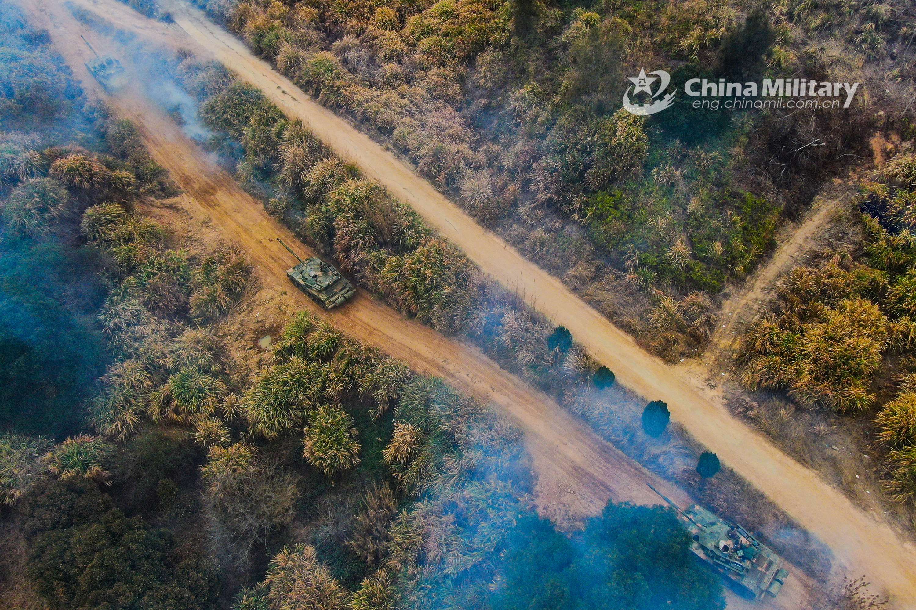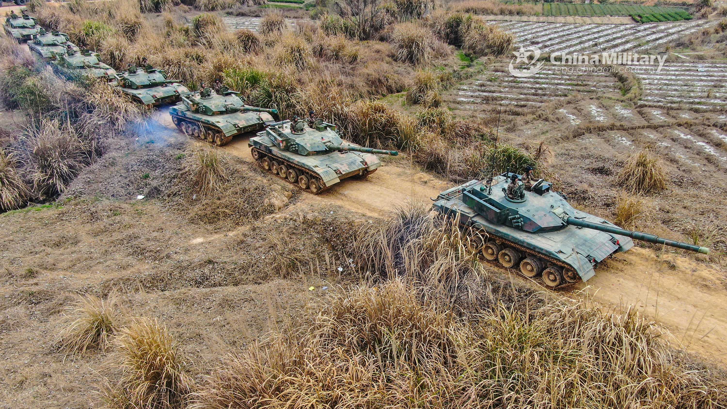 A group of main battle tanks attached to a combined arms battalion under the PLA 73rd Group Army advance to a designated training field for a realistic training exercise on February 23, 2021. (eng.chinamil.com.cn/Photo by Liu Zhiyong)