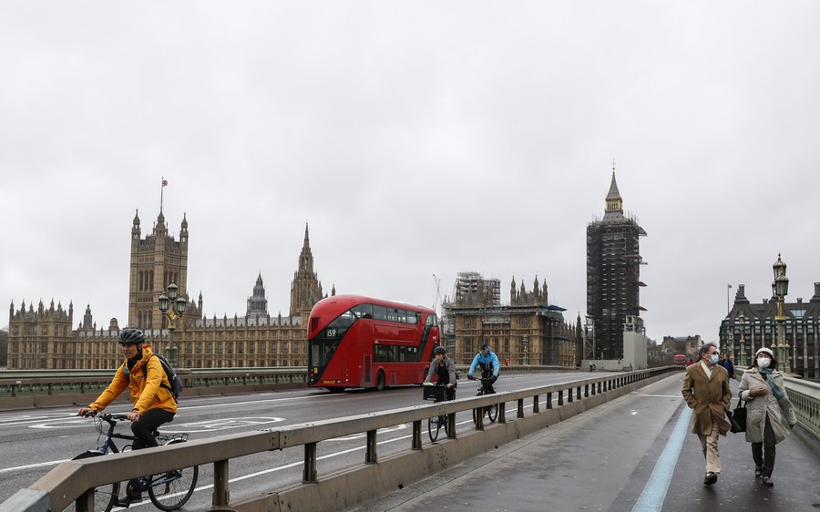 People commute along Westminster Bridge in London, Britain, Feb. 17, 2021. (Xinhua/Han Yan)