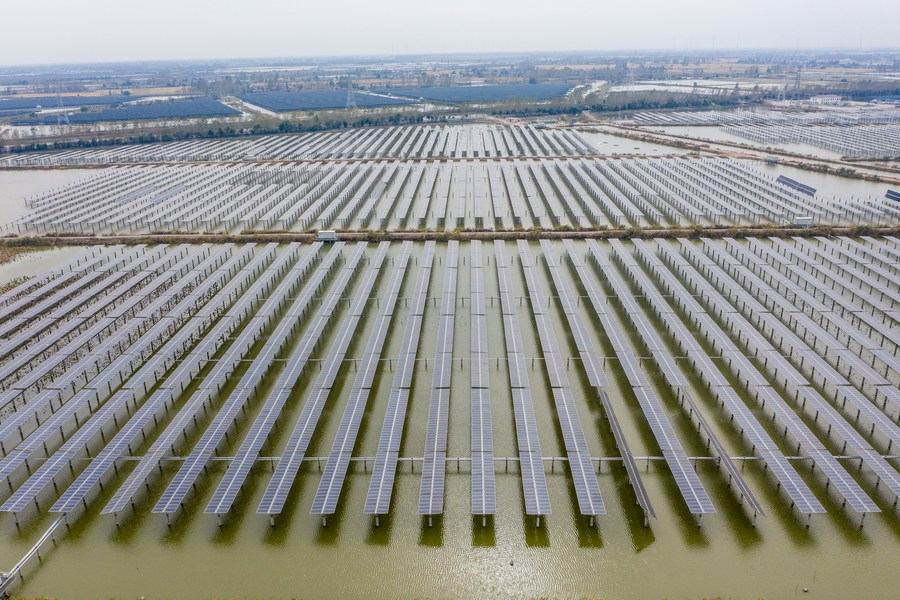 Aerial photo taken on Nov. 5, 2020 shows photovoltaic solar panels in Sheyanghu Township of Baoying County, east China's Jiangsu Province. (Xinhua/Li Bo)