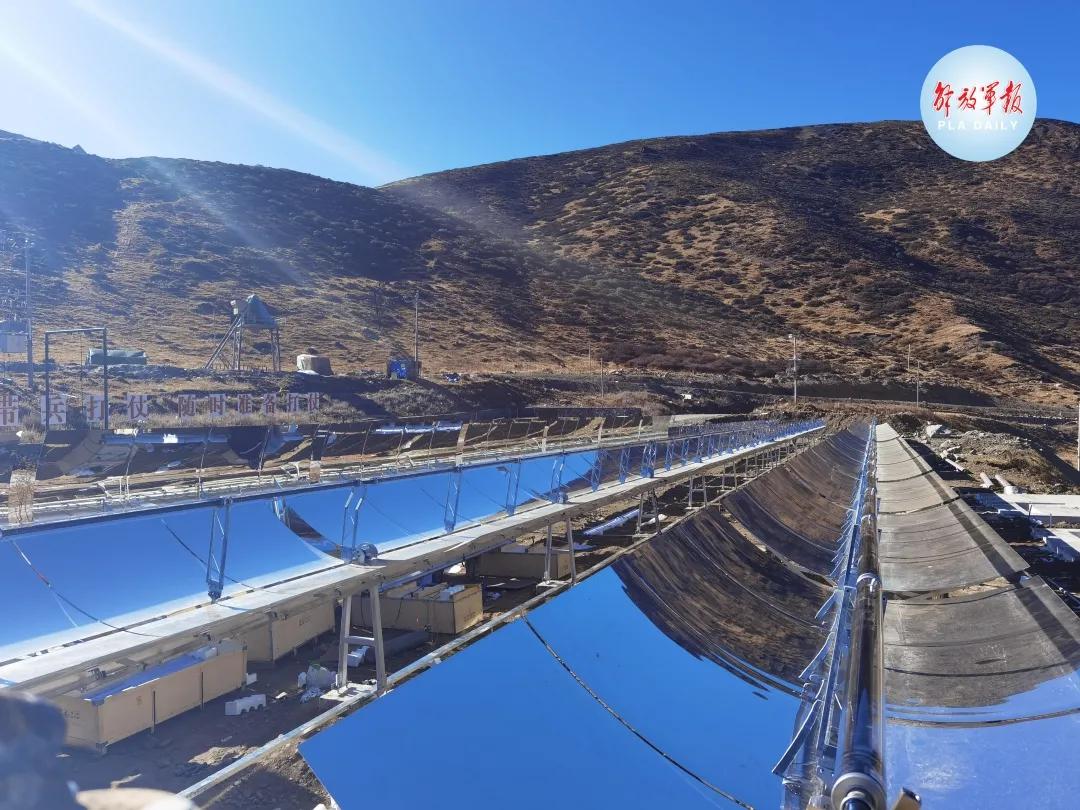 Photo shows a parabolic solar trough heating system. (Photo courtesy of PLA Daily)