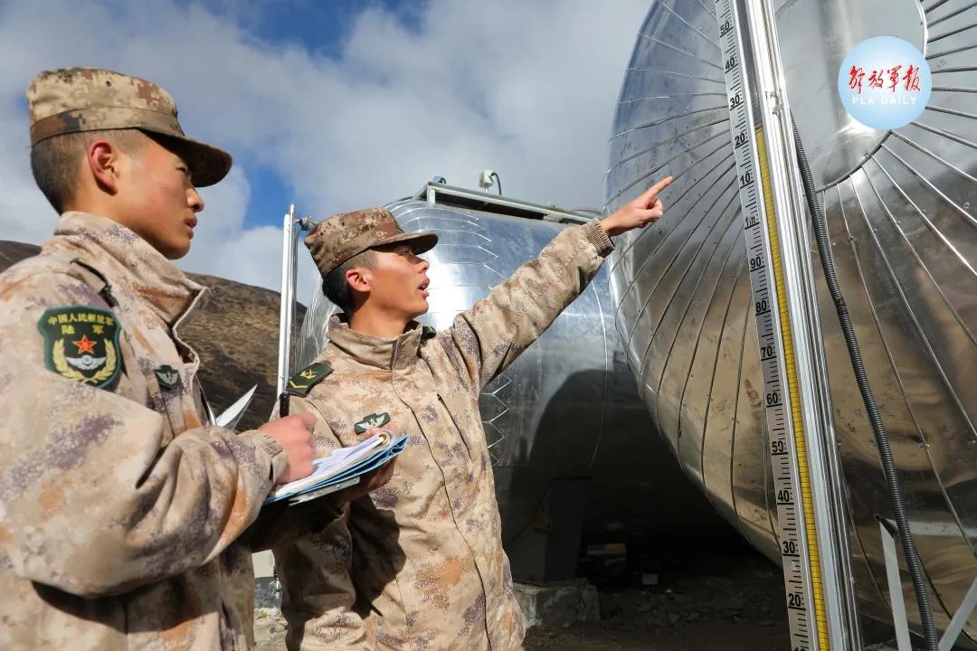 PLA soldiers observe the reading of a storage tank. (Photo courtesy of PLA Daily)