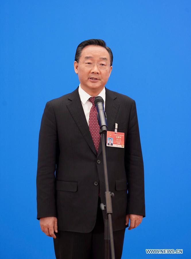 Minister of Agriculture and Rural Affairs Tang Renjian gives an interview via video link after the opening meeting of the fourth session of the 13th National People's Congress (NPC) in Beijing, capital of China, March 5, 2021. (Xinhua/Cai Yang)