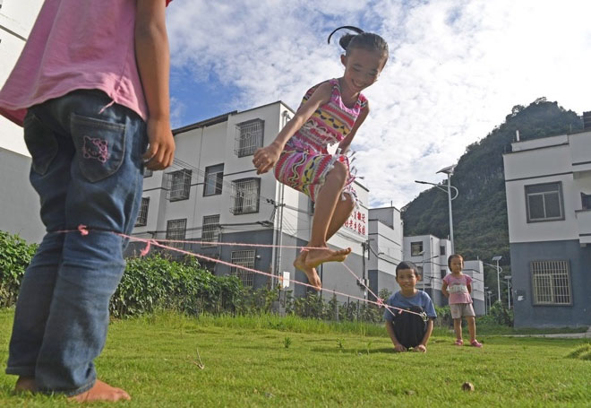 Children play in front of their new houses inside a poverty-relief resettlement site (Photo/Xinhua)
