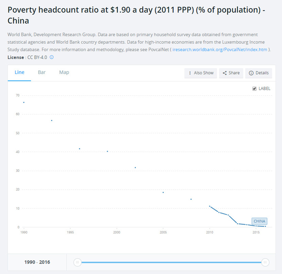 According to the World Bank, about 66.3 percent of Chinese people lived below the international poverty line in 1990 while the number slumped to only 0.5 percent in 2016 (the most recent World Bank figure). Figures revealed by the World Bank prove the authenticity of China's statistics.