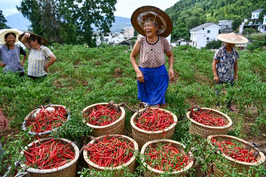 Villagers harvest fresh peppers at Qinggangba Village, Tangtou Township in Sinan County in southwest China's Guizhou Province, Aug. 12, 2020. (Xinhua/Yang Wenbin)