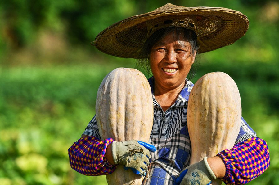 A farmer displays newly-harvested pumpkins in Xujiaba Township, Sinan County in southwest China's Guizhou Province, Aug. 12, 2020. (Xinhua/Yang Wenbin)