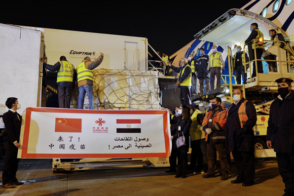 The first batch of COVID-19 vaccines provided by China for Egypt arrive in Cairo, Feb. 23, 2021. (Photo from the official website of the Chinese Embassy in Egypt)
