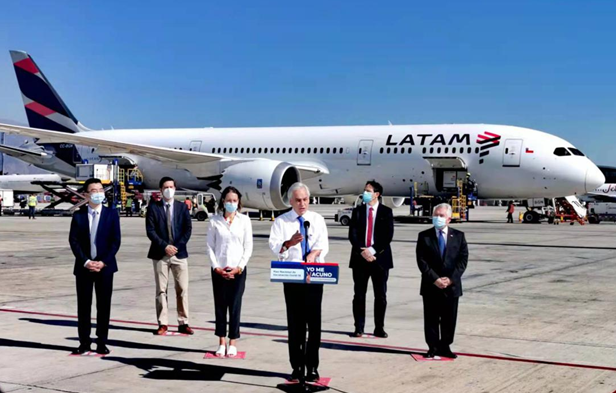 Chilean President Sebastian Pinera welcomes a shipment of nearly 2 million COVID-19 vaccines developed by Chinese firm Sinovac Biotech at Santiago international airport in Santiago, Chile, Jan. 28, 2021. (Photo from the official website of the Chinese Embassy in Chile)