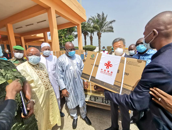 A batch of China-donated COVID-19 vaccines arrive in Conakry, capital of Guinea, March 3. Photo shows an official with the Chinese Embassy in Guinea delivering the vaccines to the Guinean side. (Photo from the Chinese Embassy in Guinea)
