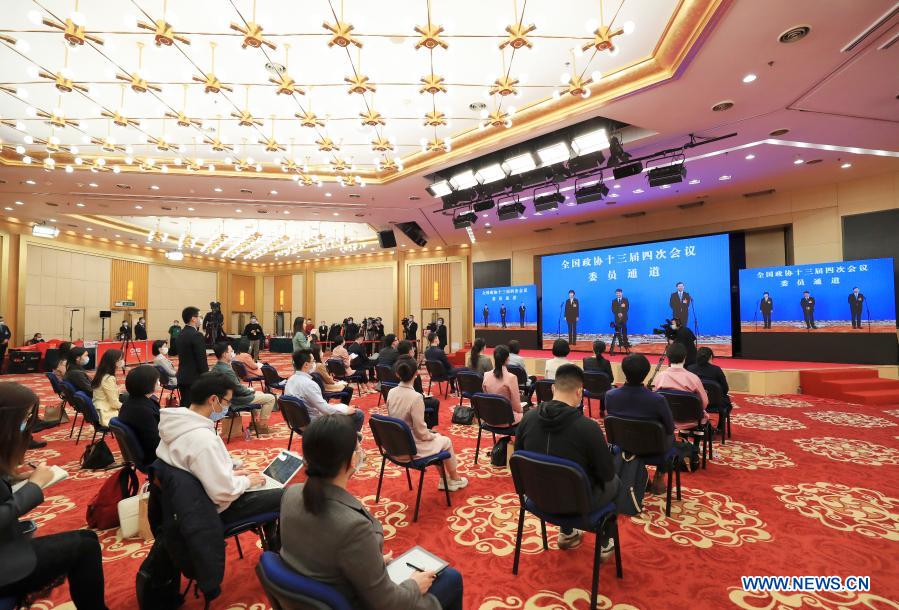 Journalists are seen during an interview via video link at the Media Center Hotel in Beijing, capital of China, March 7, 2021. Members of the 13th National Committee of the Chinese People's Political Consultative Conference (CPPCC) took questions via video link at the Great Hall of the People in Beijing ahead of the second plenary meeting of the fourth session of the 13th CPPCC National Committee on Sunday. (Xinhua/Wang Nan)