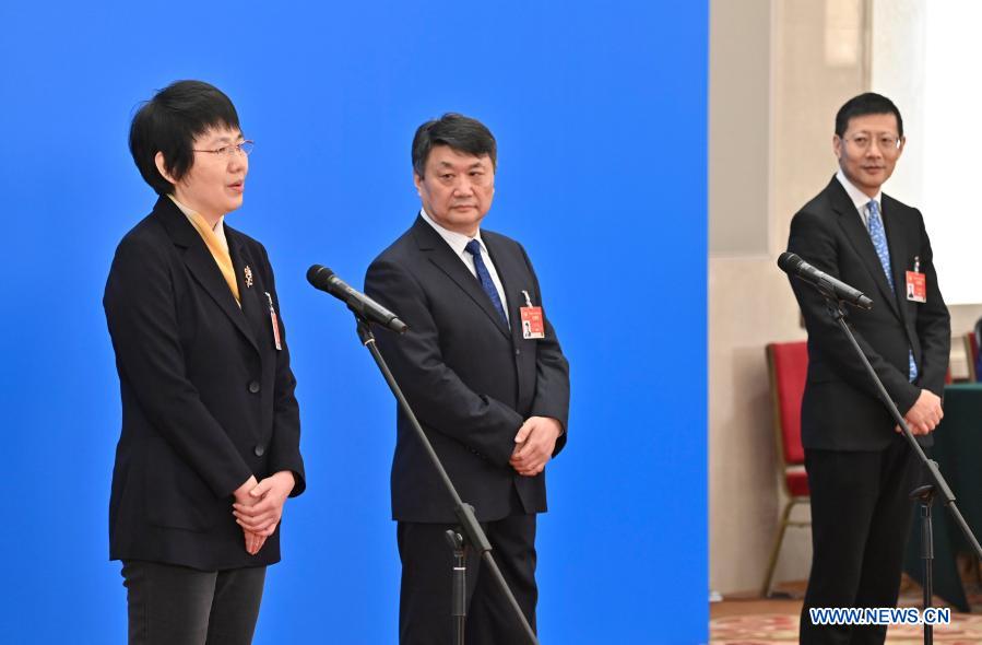 Zhou Yumei (L), a member of the 13th National Committee of the Chinese People's Political Consultative Conference (CPPCC), gives an interview via video link ahead of the second plenary meeting of the fourth session of the 13th CPPCC National Committee at the Great Hall of the People in Beijing, capital of China, March 7, 2021. (Xinhua/Li Xin)