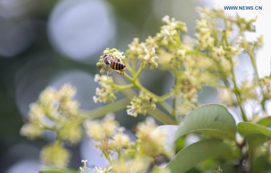 A bee is seen among litchi flowers in Yongxing Township of Haikou City, east China's Hainan Province, March 7, 2021. (Photo by Liu Yuhe/Xinhua)