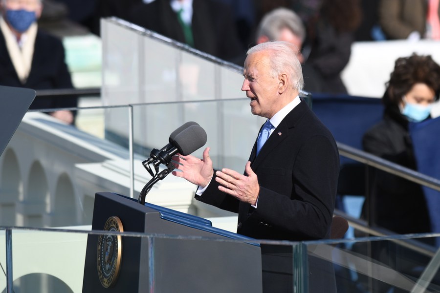 U.S. President Joe Biden delivers his inaugural address after he was sworn in as the 46th President of the United States in Washington, D.C., the United States, on Jan. 20, 2021. (Xinhua/Liu Jie)