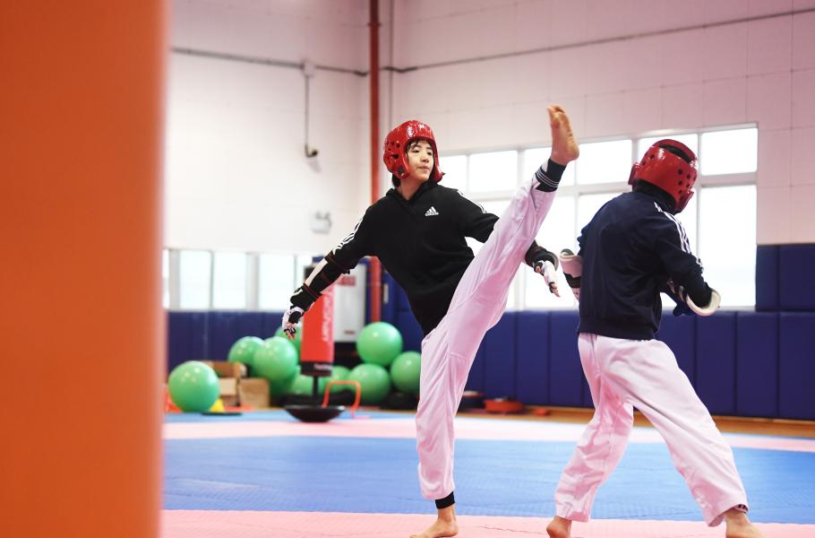 Taekwondo athlete Zhang Can (L) was training in Chongqing on December 2, 2020. (Xinhua/Wang Quanchao)