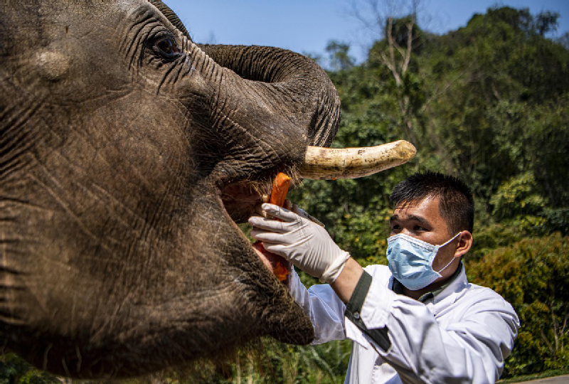 An elephant undergoes a health check at the Asian Elephant Breeding and Rescue Center in Xishuangbanna Dai autonomous prefecture, Yunnan province. [Photo/Xinhua]
