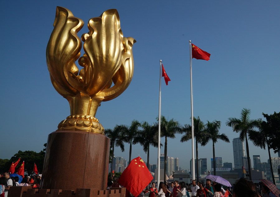 People attend a national flag raising ceremony at the Golden Bauhinia Square in Hong Kong, south China, Sept. 8, 2019. (Xinhua/Li Gang)
