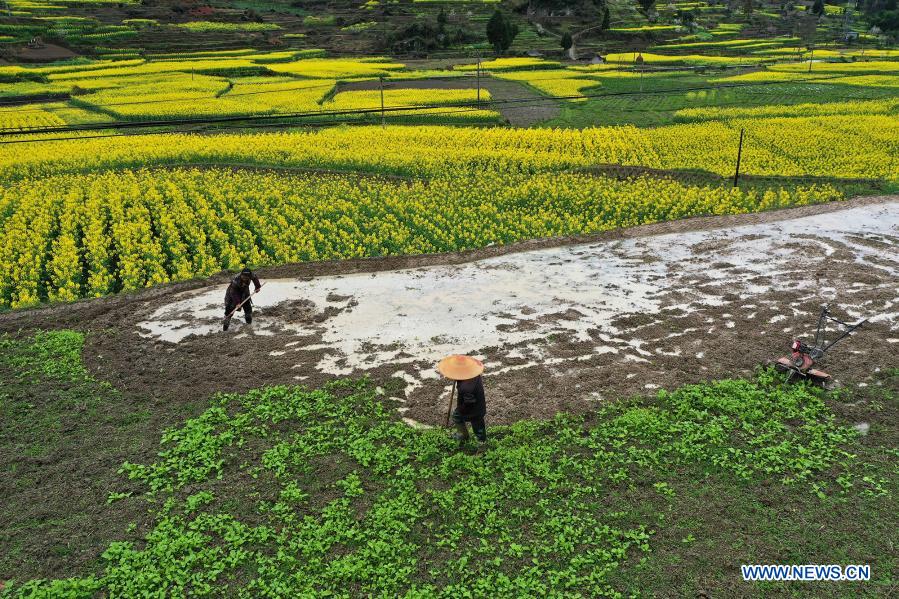 Farmers work in the field in Yuqing County of Zunyi City, southwest China's Guizhou Province, March 10, 2021. (Photo by Mu Mingfei/Xinhua)