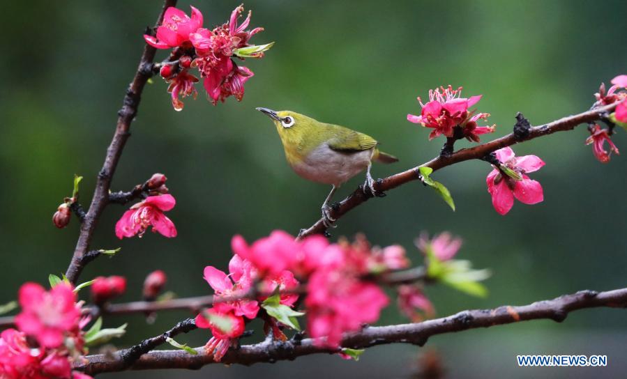 A bird stands on a tree branch in Hengyang City, central China's Hunan Province, on March 10, 2021. (Photo by Cao Zhengping/Xinhua)