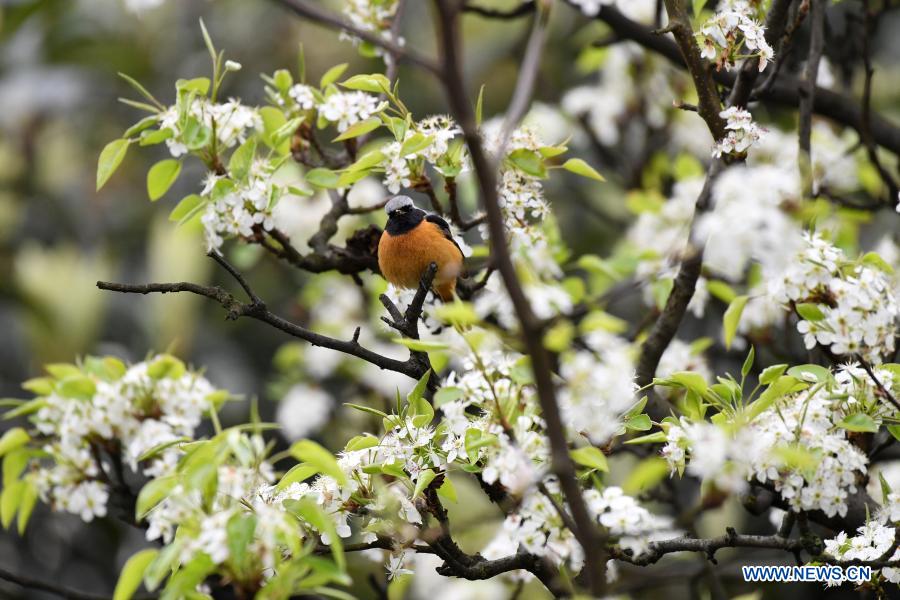 A bird stands on a tree branch in Renhuai City, southwest China's Guizhou Province, on March 10, 2021. (Photo by Chen Yong/Xinhua)