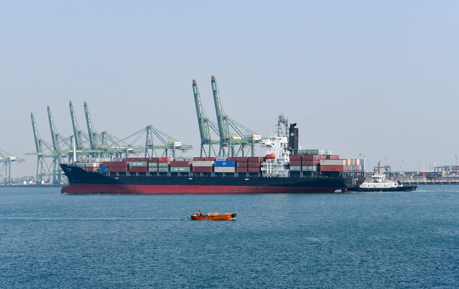 A container ship sails through a container dock of the Tianjin Port in east China's Tianjin Municipality, Nov. 4, 2020. (Xinhua/Sun Fanyue)