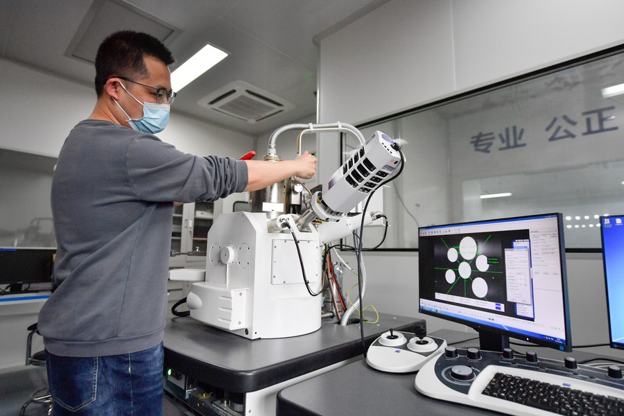 A technician tests an electronic microscope at the Lubrication and Friction Testing Center, Tsinghua University Tianjin Research Institute for Advanced Equipment, in north China's Tianjin, Feb. 24, 2021. (Xinhua/Sun Fanyue)