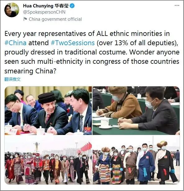 On March 8, Chinese Foreign Ministry spokesperson Hua Chunying posted a tweet that said: "Every year representatives of ALL ethnic minorities in #China attend #Two Sessions (over 13% of all deputies), proudly dressed in traditional costume. Wonder anyone seen such multi-ethnicity in congress of those countries smearing China?"