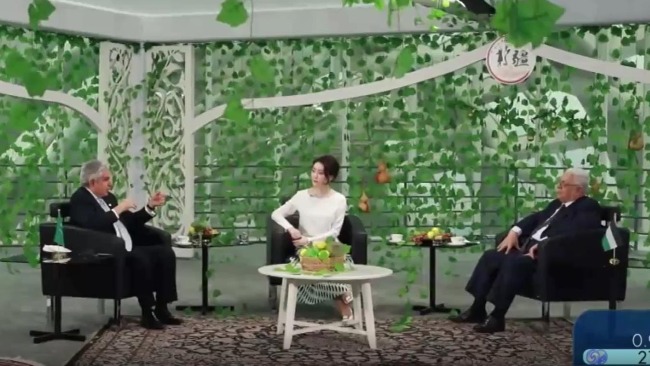 Palestinian Ambassador to China Fariz Mehdawi (R) and Saudi Arabian Ambassador to China Turki M. A. Almadi (L) sit down for an interview. (Screenshot from Phoenix TV)