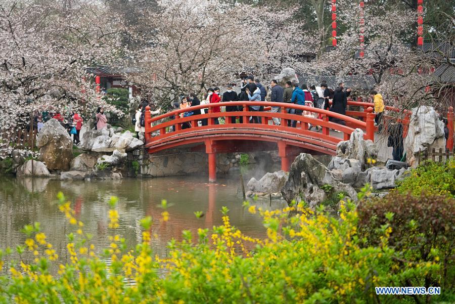 Tourists view blooming cherry blossoms in Wuhan (4)