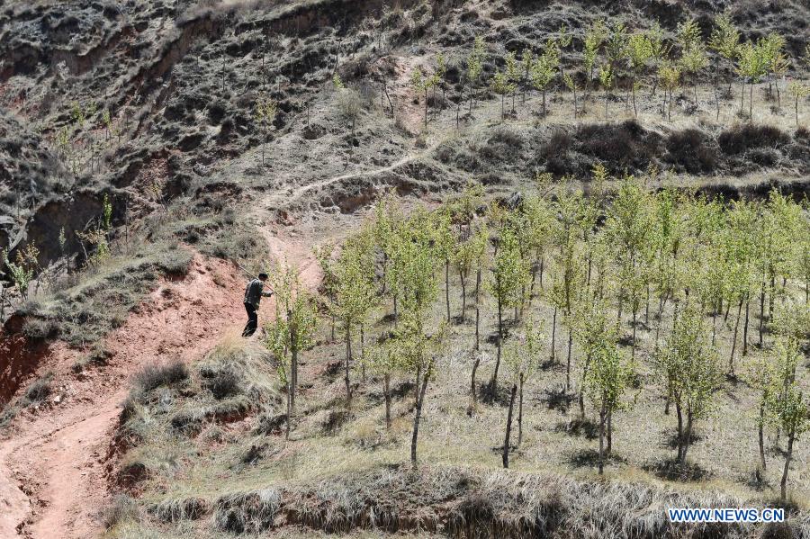 Photo taken on May 12, 2015 shows villager Huang Shenghong walking past seedlings he planted years ago in Mao'er Village, Huangzhong County, northwest China's Qinghai Province. Friday marks China's National Tree Planting Day. With the efforts of volunteers across the country, green lands has covered more areas of China and the eco-friendly development concept is seeded in people's heart. (Xinhua/Wu Gang)