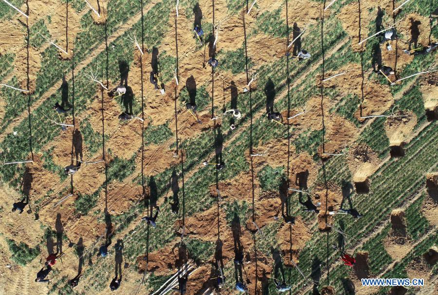 Aerial photo taken on March 12, 2019 shows volunteers planting trees in Boyan Village, Wu'an City of north China's Hebei Province. Friday marks China's National Tree Planting Day. With the efforts of volunteers across the country, green lands has covered more areas of China and the eco-friendly development concept is seeded in people's heart. (Xinhua/Wang Xiao)
