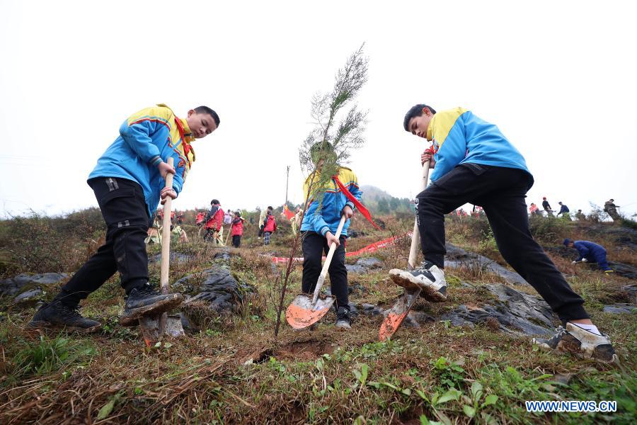 Students plant saplings in Danzhai County, southwest China's Guizhou Province, March 12, 2021. Friday marks China's National Tree Planting Day. (Photo by Huang Xiaohai/Xinhua)